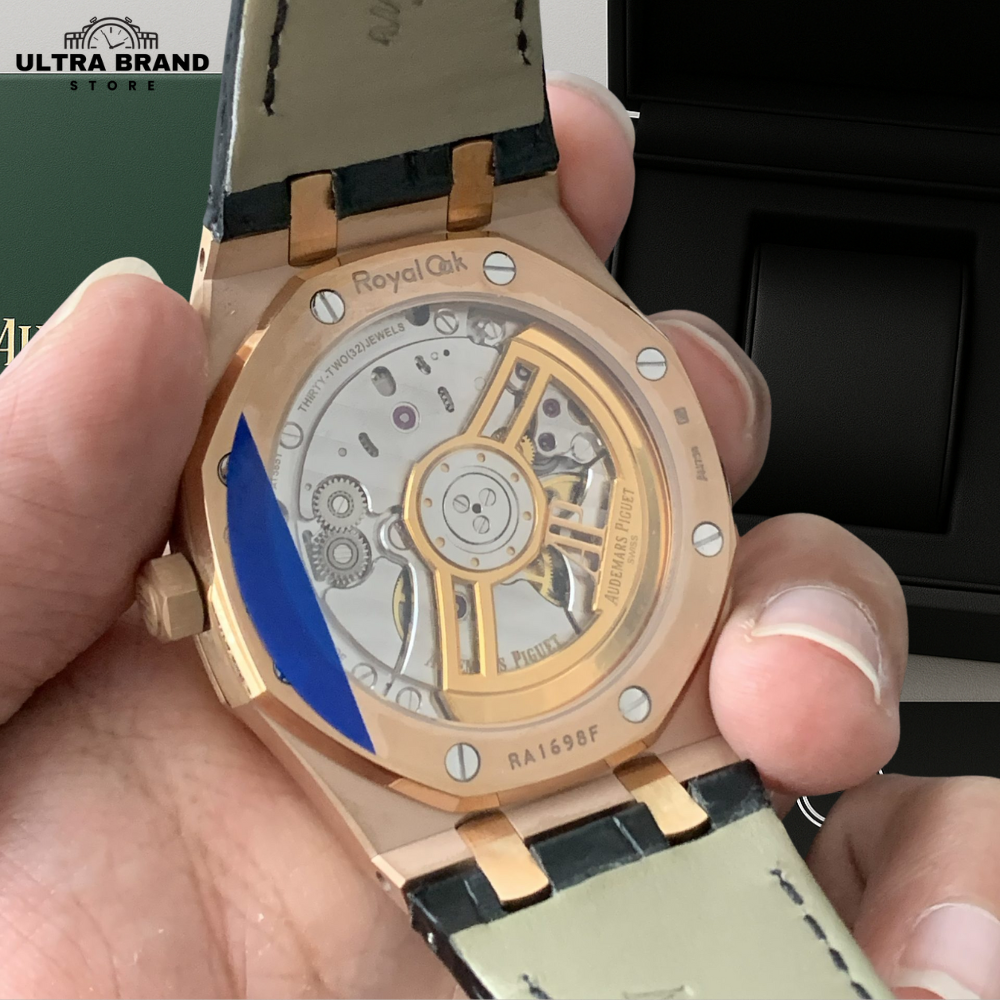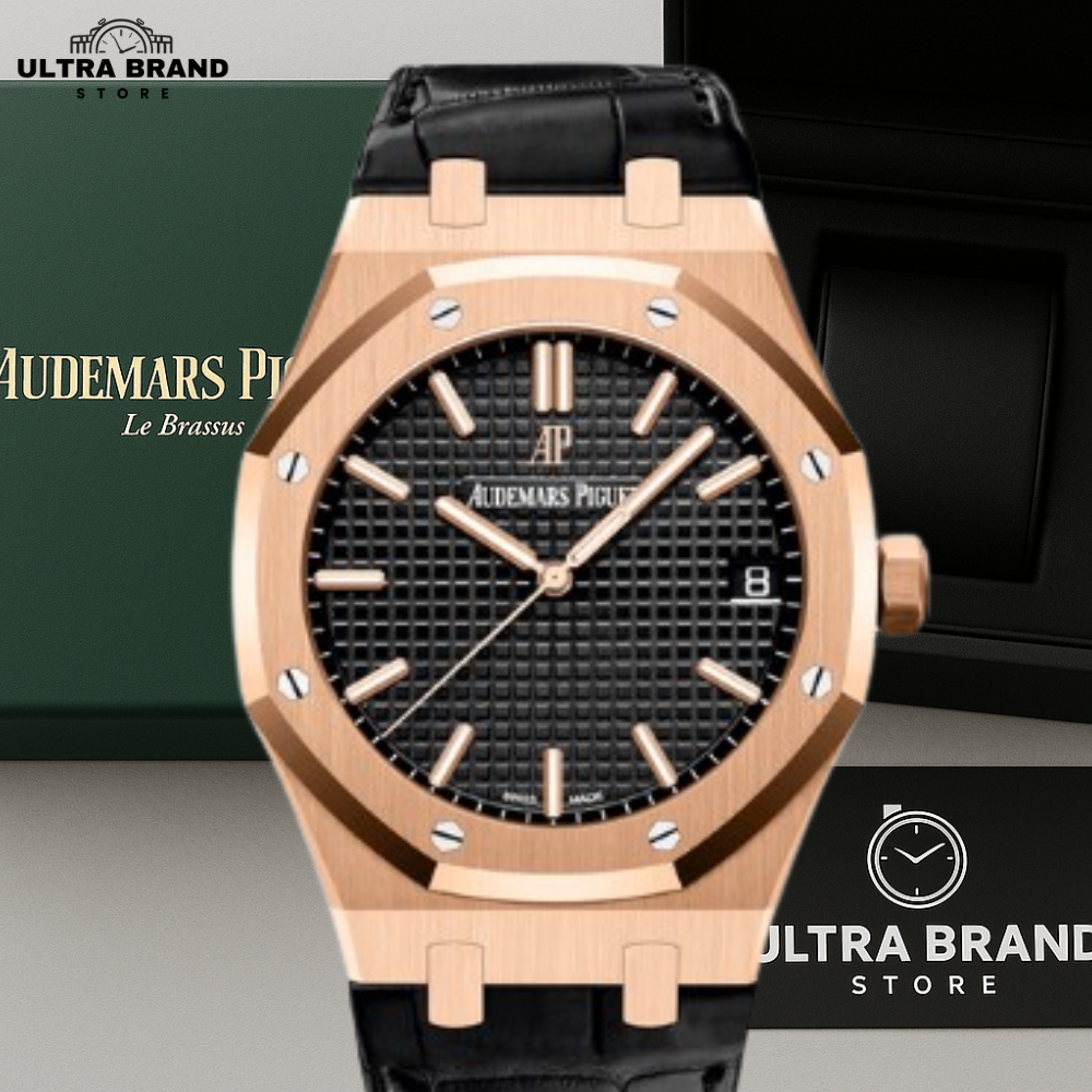 Featuring a 41mm case with Rose Gold plating on stainless steel, the watch delivers a luxurious shine while maintaining strength and durability. The standout feature is its Black dial with the signature “Tapisserie Evolutive” pattern, complemented by refined hour markers and Royal Oak hands coated with luminescent material for enhanced nighttime visibility.