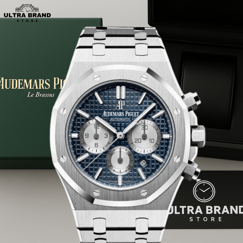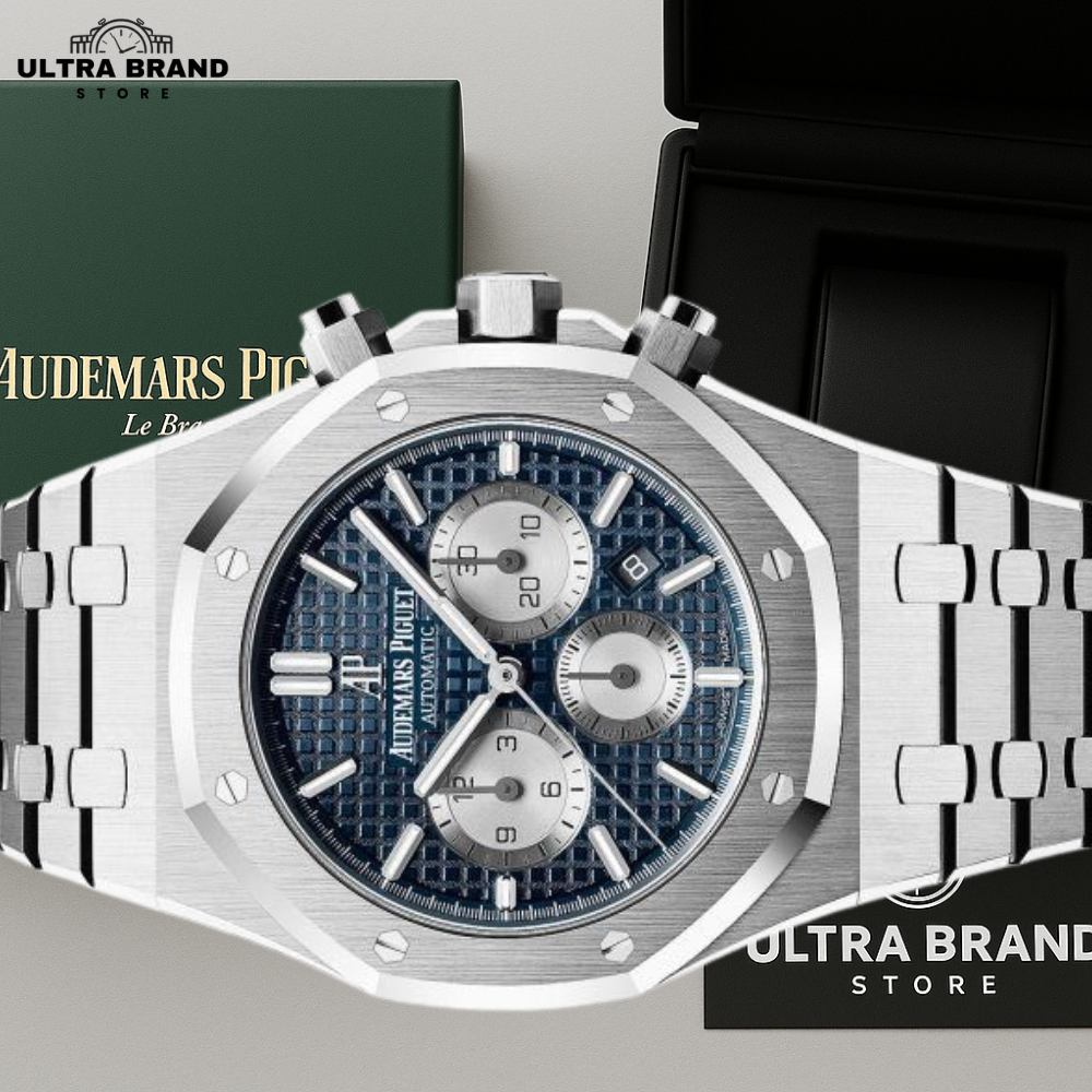 The watch features a stunning blue “Grande Tapisserie” dial, complemented by rhodium-toned chronograph sub-dials. Applied 904L stainless steel hour markers and Royal Oak hands are finished with luminescent coating, ensuring excellent visibility in low-light conditions. The dial layout is clean, balanced, and unmistakably Royal Oak.