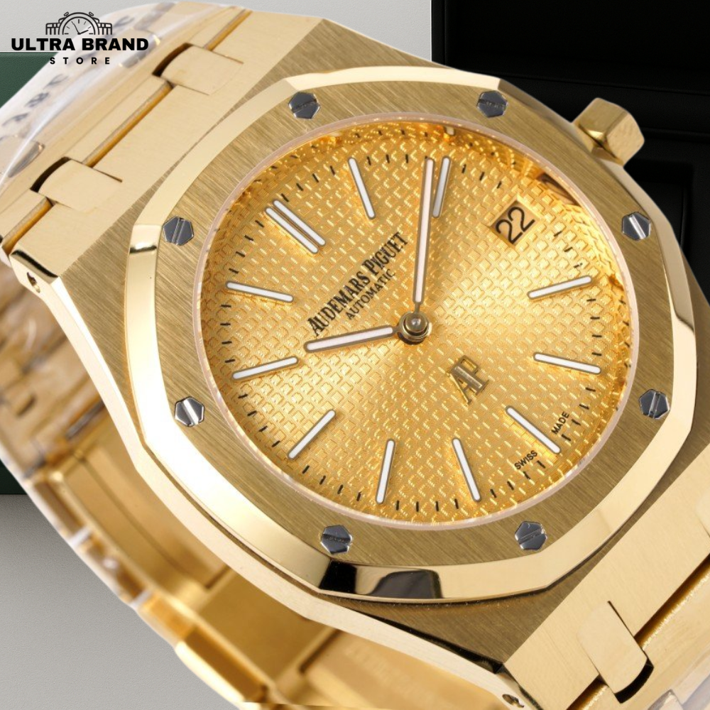 The 39mm ultra-thin case maintains the elegant Jumbo proportions, while the Champagne dial—also known as yellow gold dial—adds a luxurious touch. The watch is powered by the 1:1 Swiss Clone Audemars Piguet 2121 Movement, meticulously replicated to perform just like the original. The sapphire crystal ensures scratch resistance and clarity, while the clasp is identical to the genuine model, completing the flawless aesthetic.