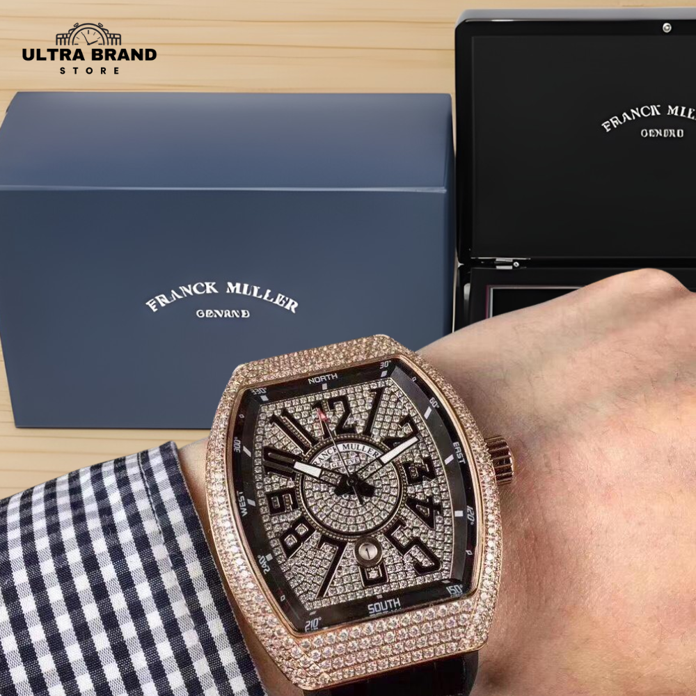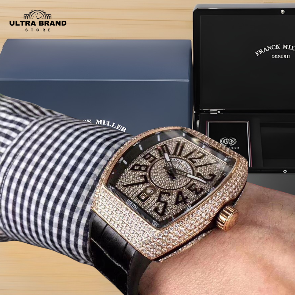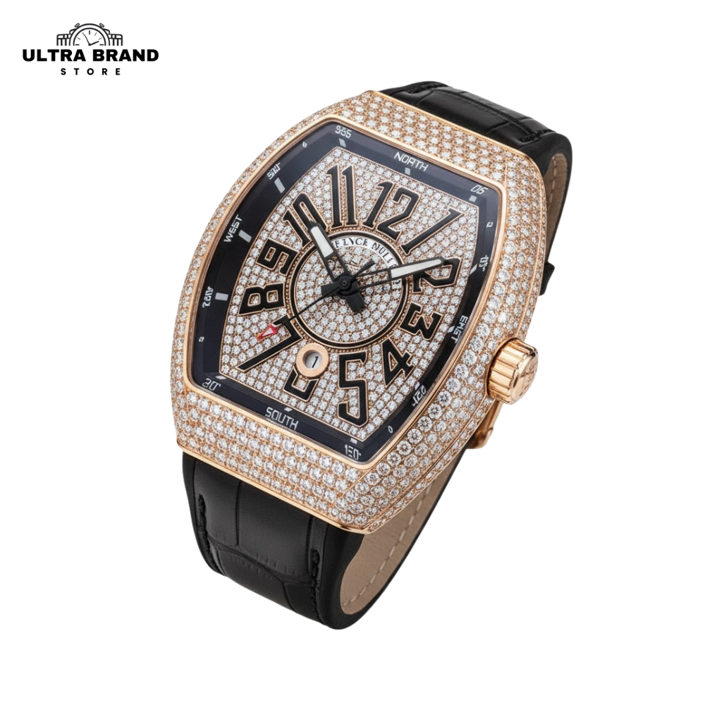 Step into bold luxury with the Iced Franck Muller Vanguard V45 Rose Gold Replica, fully loaded with high-clarity simulated diamonds from case to bezel. Designed for presence and precision, this Vanguard delivers the iconic tonneau-shaped build with a rich rose-gold finish and a sharp black dial, creating a striking contrast worthy of attention.