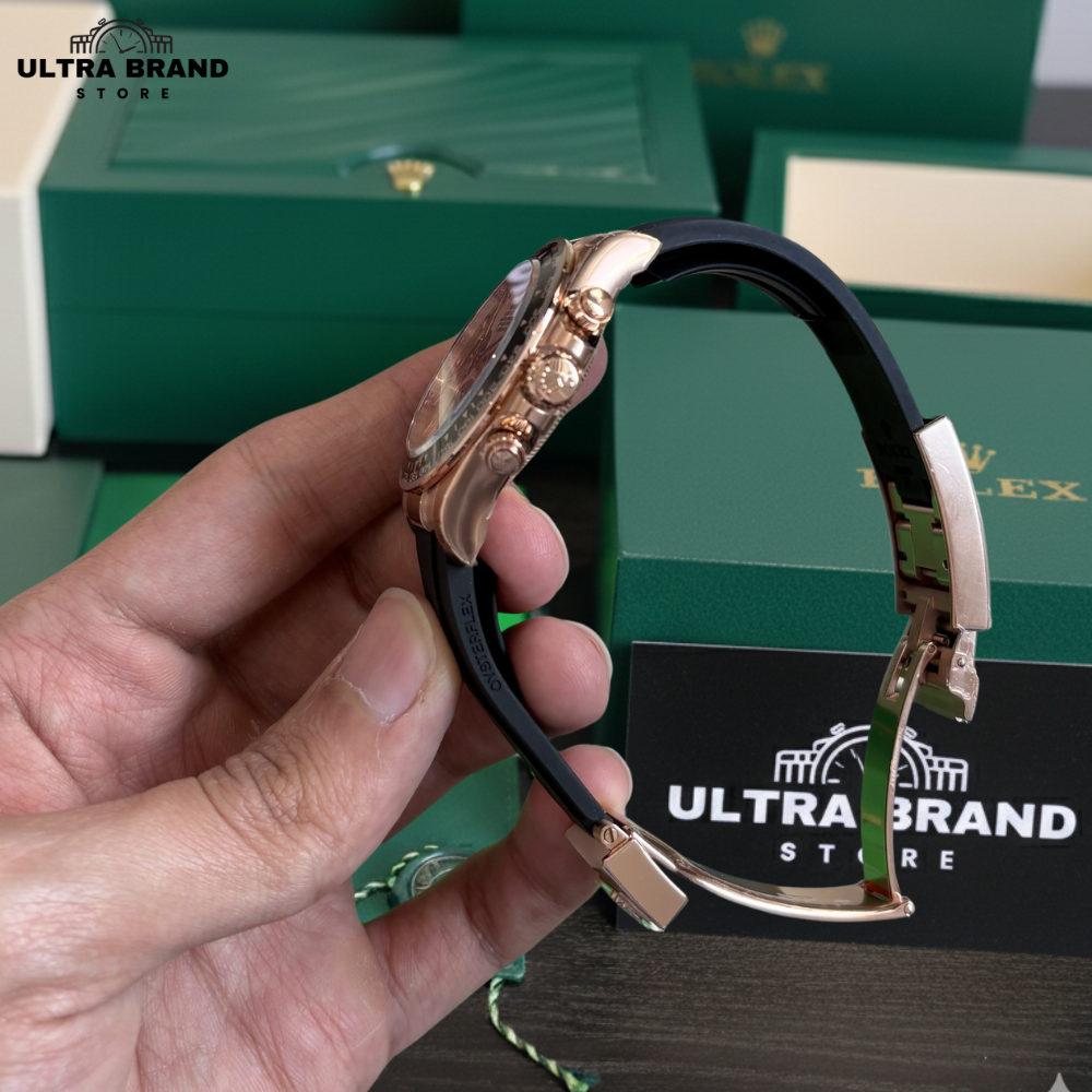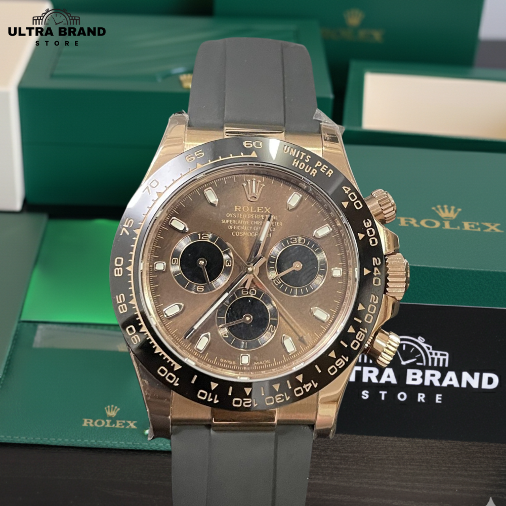 Experience the exquisite craftsmanship of the Rolex Daytona 116515LN in rose gold with a chocolate dial and black sub-dials. This Oysterflex Superclone is a perfect 1:1 high-end replica, featuring a Swiss 4130 clone movement and precise chronograph functions. Designed for collectors who appreciate style, precision, and authenticity, it mirrors every detail of the genuine Daytona.