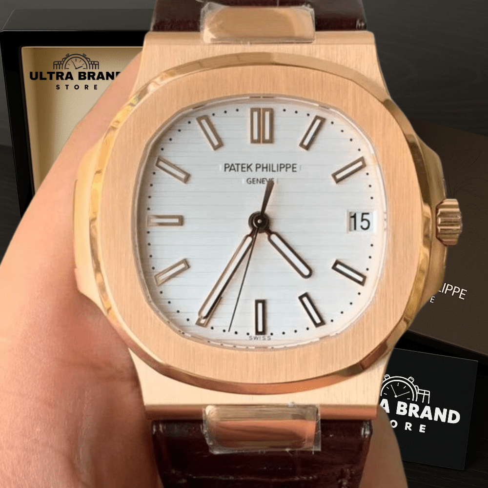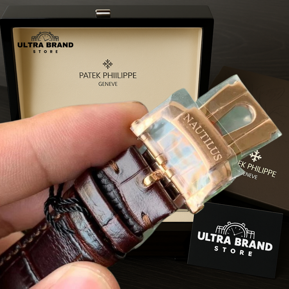 The brown leather strap adds a refined touch, perfectly complementing the rose gold case. The Swiss Clone Calibre 324 automatic movement ensures smooth and accurate timekeeping, replicating the functions of the genuine Nautilus 5711 flawlessly. A scratch-proof sapphire crystal protects the dial, while the folding buckle clasp ensures a secure and comfortable fit.