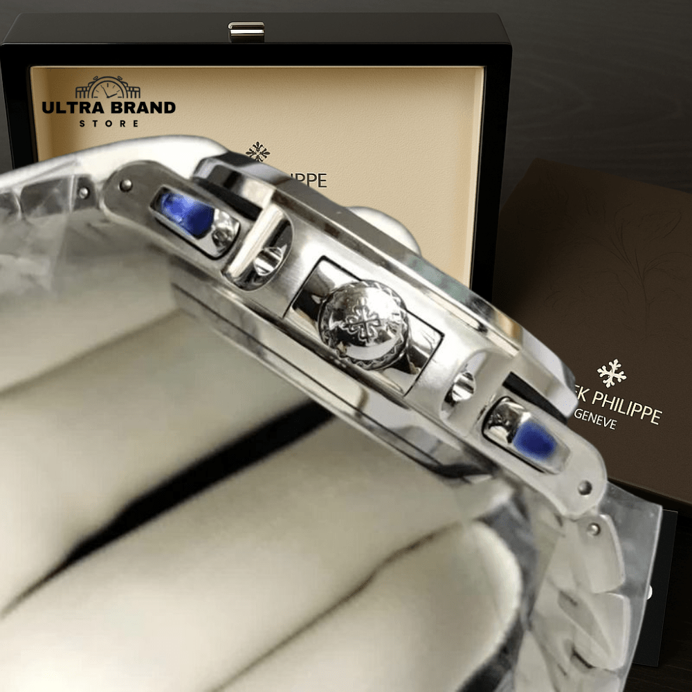 Encased in 40mm 904L stainless steel, this Nautilus clone features a striking blue dial with chronograph functionality and a date display. The stainless steel bezel complements the dial, while the integrated stainless steel bracelet ensures comfort and elegance on the wrist.