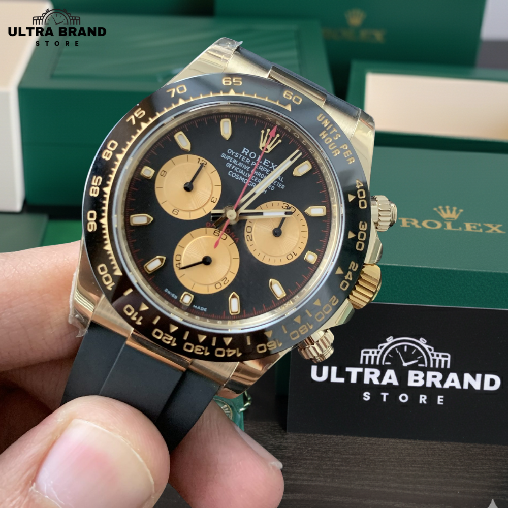 Constructed with 904L stainless steel and 18k yellow-gold plating, the case shines with a luxurious gen-like finish. The fixed tachymetric bezel is engraved with sharp, high-depth numerals for an authentic motorsport look. The sapphire crystal ensures scratch resistance and includes the laser-etched Rolex crown at 6 o’clock, matching original detailing.