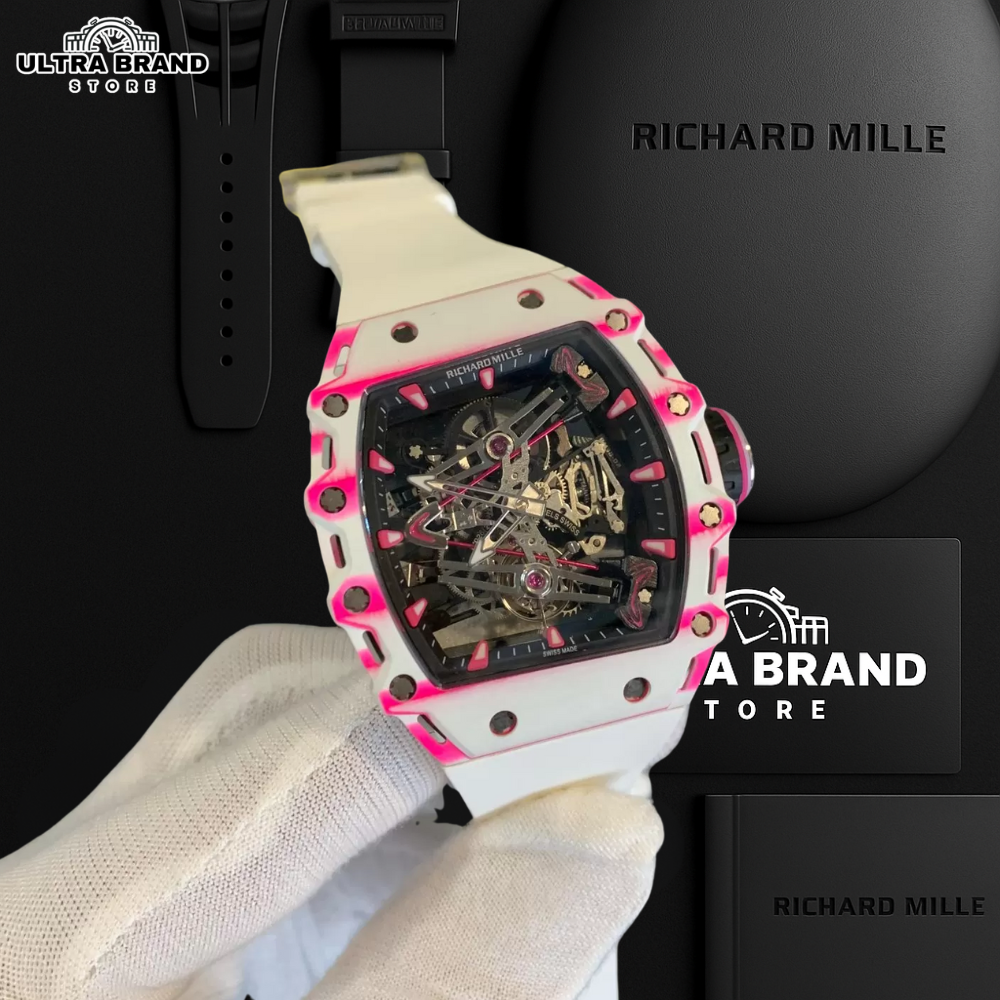 The Richard Mille RM 38-02 Bubba Watson White & Pink Super Clone is a sporty yet elegant timepiece designed for golf enthusiasts. Featuring an asymmetrical case crafted from pink and white Quartz TPT combined with Carbon TPT, this 1:1 replica mirrors the genuine RM 38-02 in both style and performance.