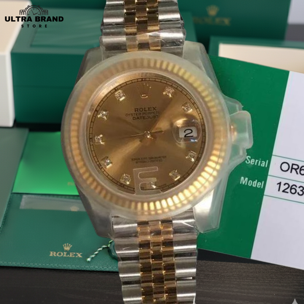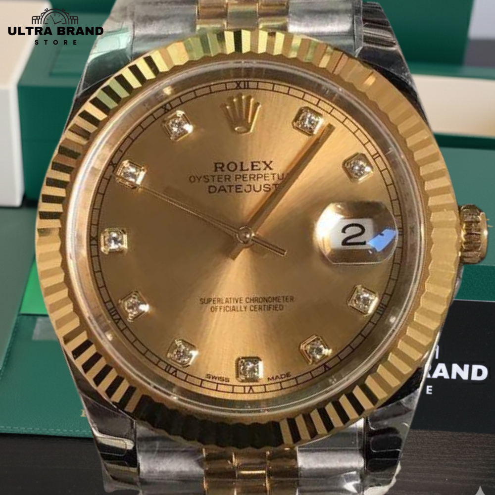 As our name suggests, we sell only luxury. This Rolex Datejust 41 Two-Tone Iced Numerals Super Clone is the ultimate in premium replica watches, featuring Swiss ETA 3135 clone movement for precise automatic timekeeping. Every detail, from the fluted gold bezel to the iced numeral dial, is crafted in 904L stainless steel for shine, weight, and durability indistinguishable from the real Rolex.