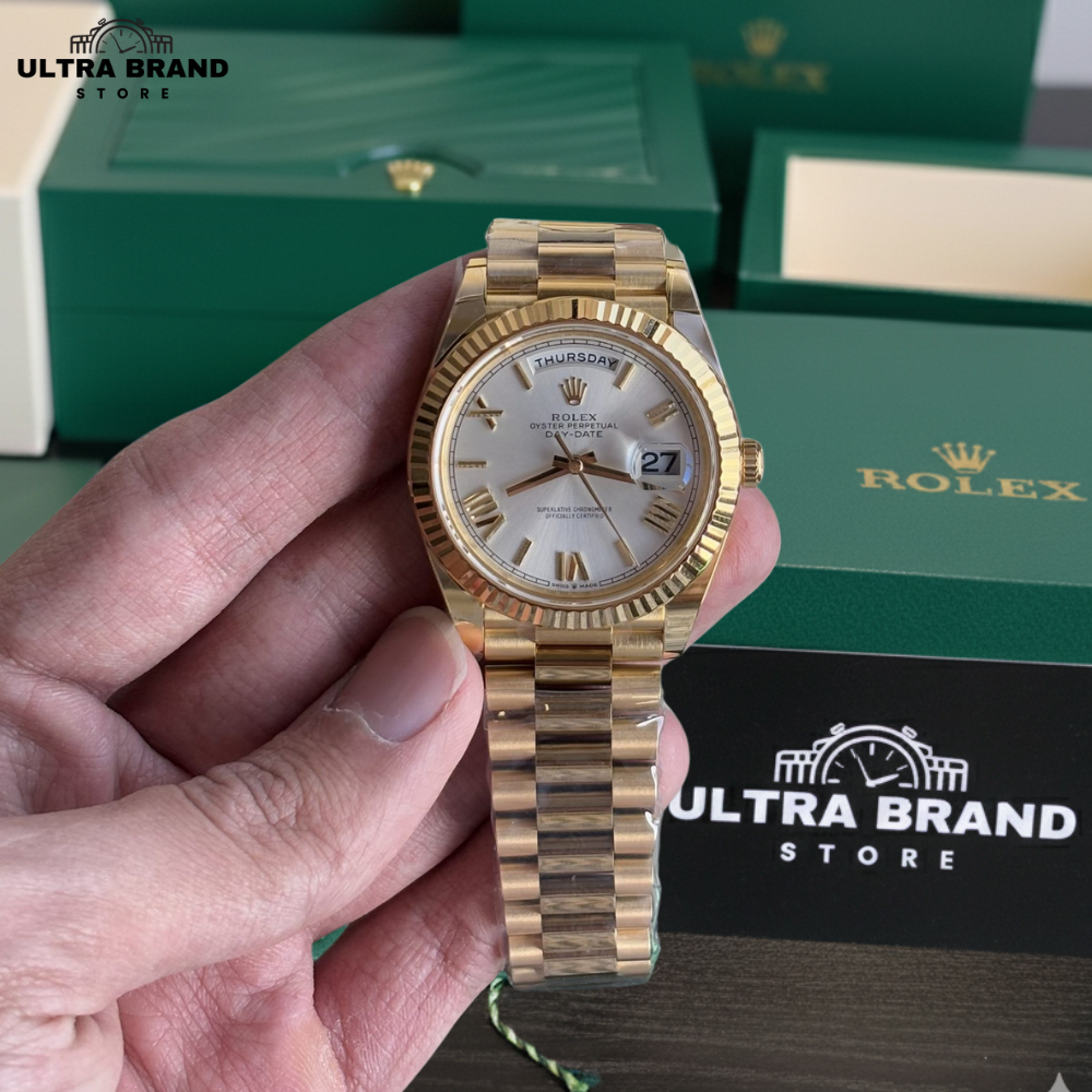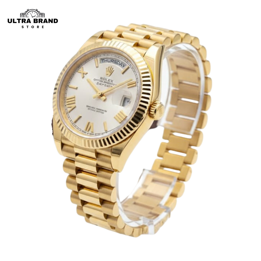 Experience the best-in-class Rolex Day-Date 40 Presidential Super Clone crafted in yellow gold and premium 904L stainless steel with a White/Silver sunburst dial that matches the original’s texture and color depth.