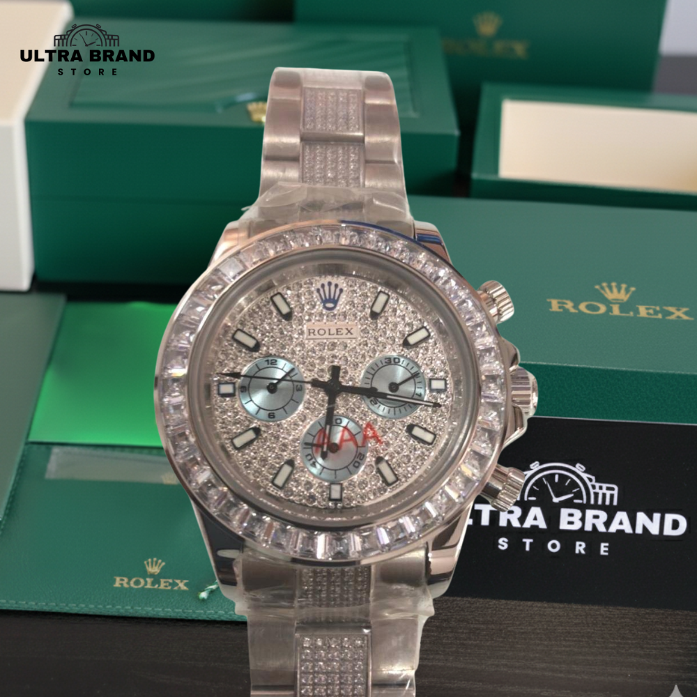 This best quality Rolex Daytona Iced replica offers the perfect balance of elegance and performance. With diamonds on both the bezel and dial, this platinum Daytona clone exudes luxury while maintaining precise timekeeping and fully functioning chronograph pushers.