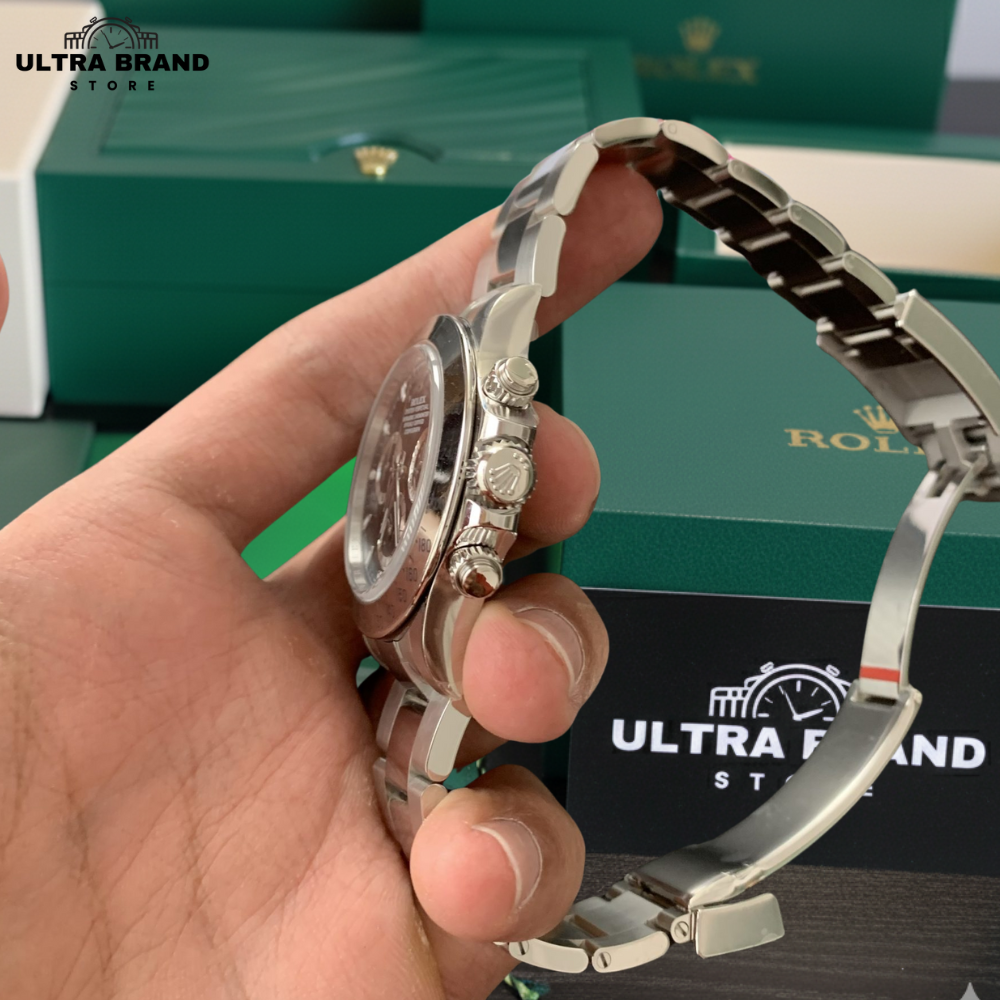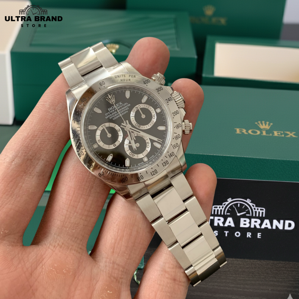 Experience the elegance and precision of the Rolex Daytona 116520 Black Dial Superclone. Expertly crafted in 904L stainless steel, this 1:1 replica captures every detail of the original Daytona. The black dial is complemented by a mirror-polished stainless steel bezel with an engraved tachymetric scale, ensuring a classic and functional design.