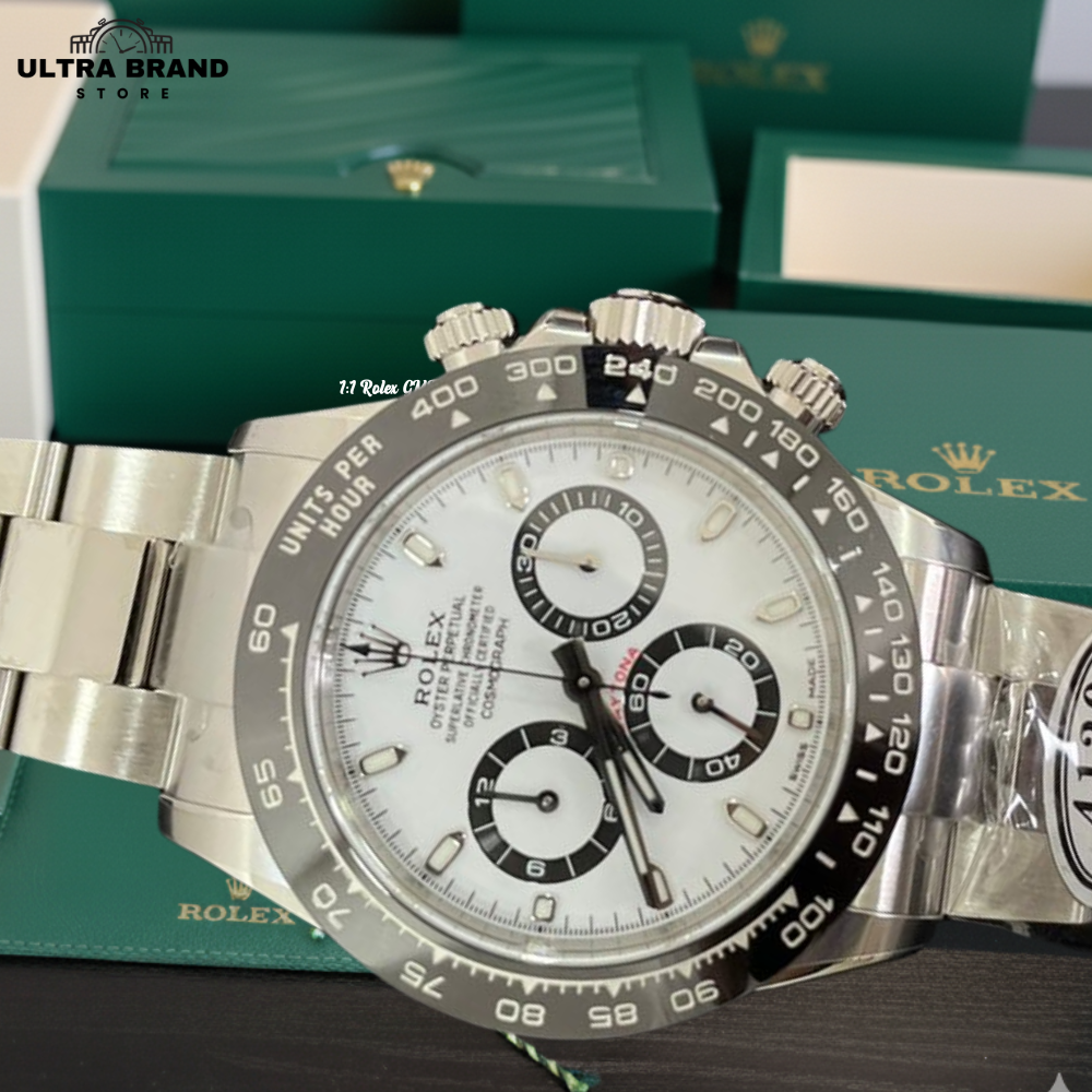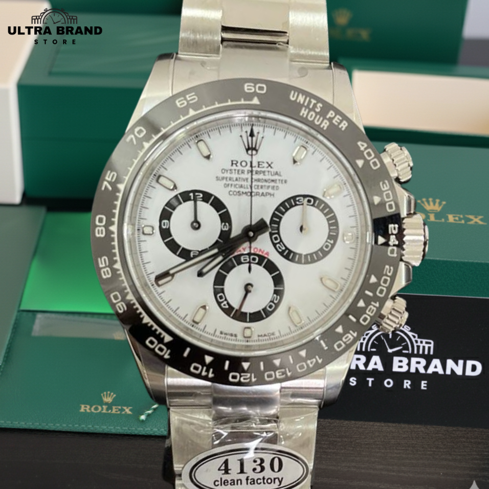 Presenting the ultimate Rolex Daytona Panda 116500LN Super Clone, crafted by Clean Factory with Swiss 4130 clone movement. This 1:1 replica mirrors the genuine Daytona in every detail — from the ceramic black bezel to the white Panda dial with chronograph sub-dials.