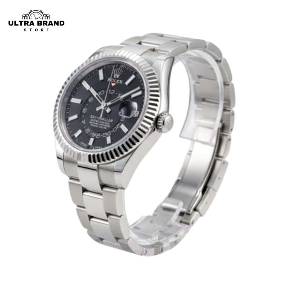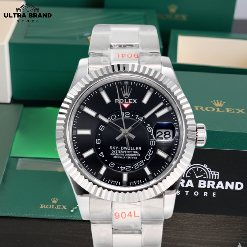 This high-end Rolex Sky-Dweller black dial replica delivers a premium, near-identical 1:1 design built for collectors and everyday luxury wear. The deep black sunburst dial with crisp calendar markers and a fully working rotating inner GMT disc makes this super clone visually stunning and mechanically impressive.