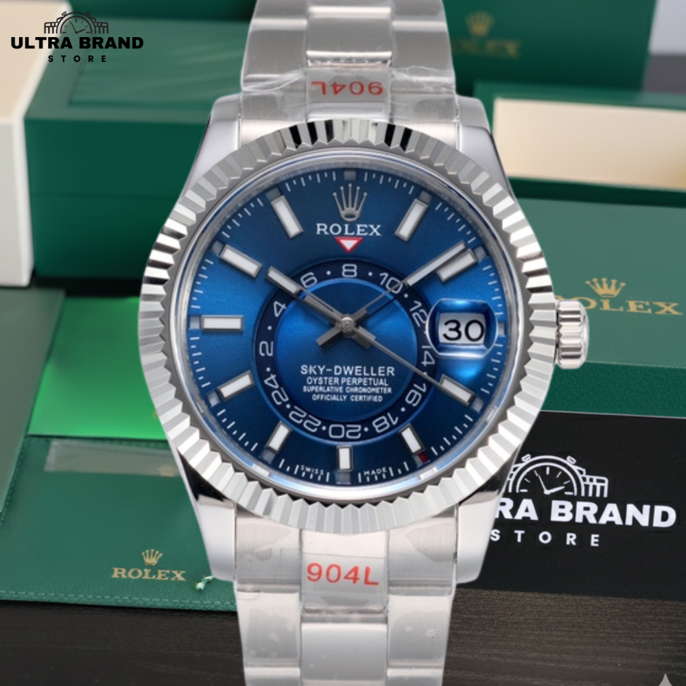 The Rolex Sky-Dweller Super Clone is a premium, high-quality replica that mirrors the genuine Rolex in design, weight, and functionality. Featuring a vibrant blue sunburst dial and a 904L stainless steel Oyster bracelet, this clone offers an elegant yet sporty look.