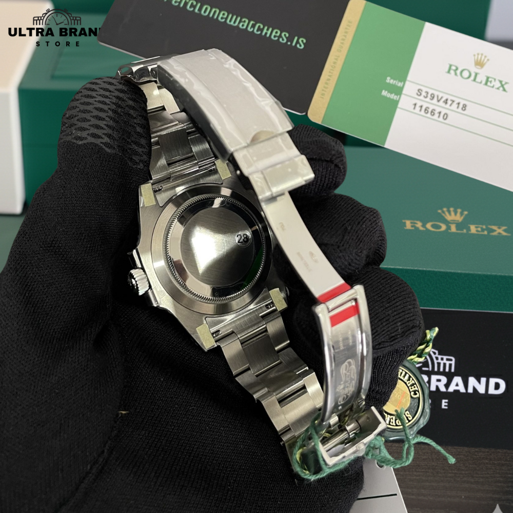 The sapphire crystal features AR coating for clear visibility and includes a laser-etched Rolex crown at 6 o’clock, just like genuine Rolex super replicas. The bracelet comes with a fully functional GlideLock extension clasp, a signature Submariner feature for easy size adjustment without tools.