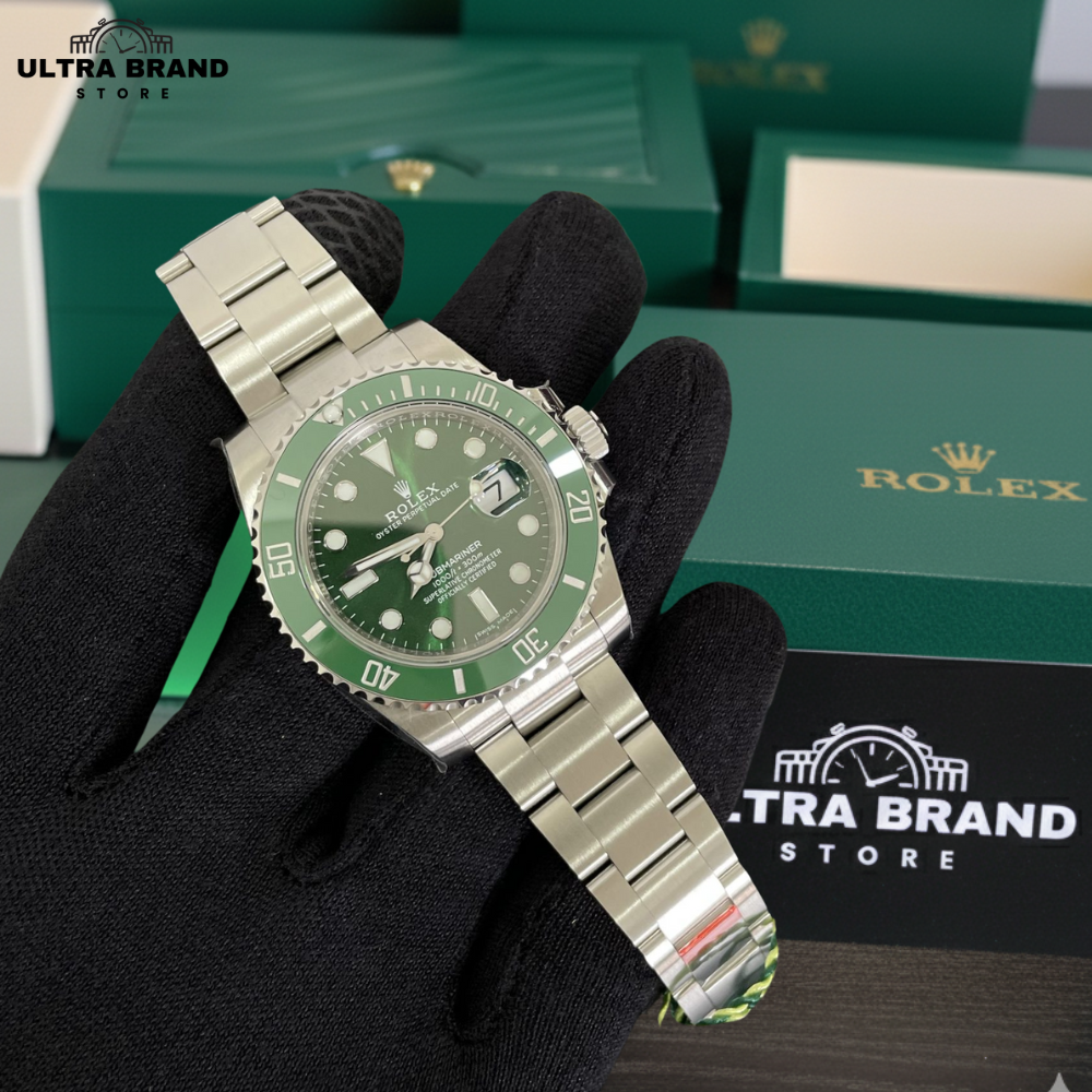 Made from 904L Stainless Steel (Oystersteel), the same material used in authentic Rolex sports models, the case and bracelet offer superior shine, durability, weight, and corrosion resistance. The green ceramic bezel is scratch-resistant and color-matched to the original Rolex Hulk aesthetic.